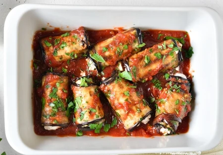 Zapiekane roladki z bakłażana podawaj na ciepło, od razu po przygotowaniu, najlepiej posypane świeżą bazylią.