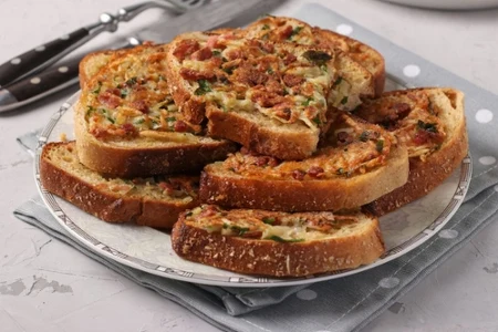 7. Kromki układaj na blaszce wyłożonej papierem do pieczenia. Piecz je przez 15-20 minut w 180 stopniach Celsjusza do zrumienienia i rozpuszczenia sera. Zapiekanki gyros podawaj na ciepło, póki są chrupiące.