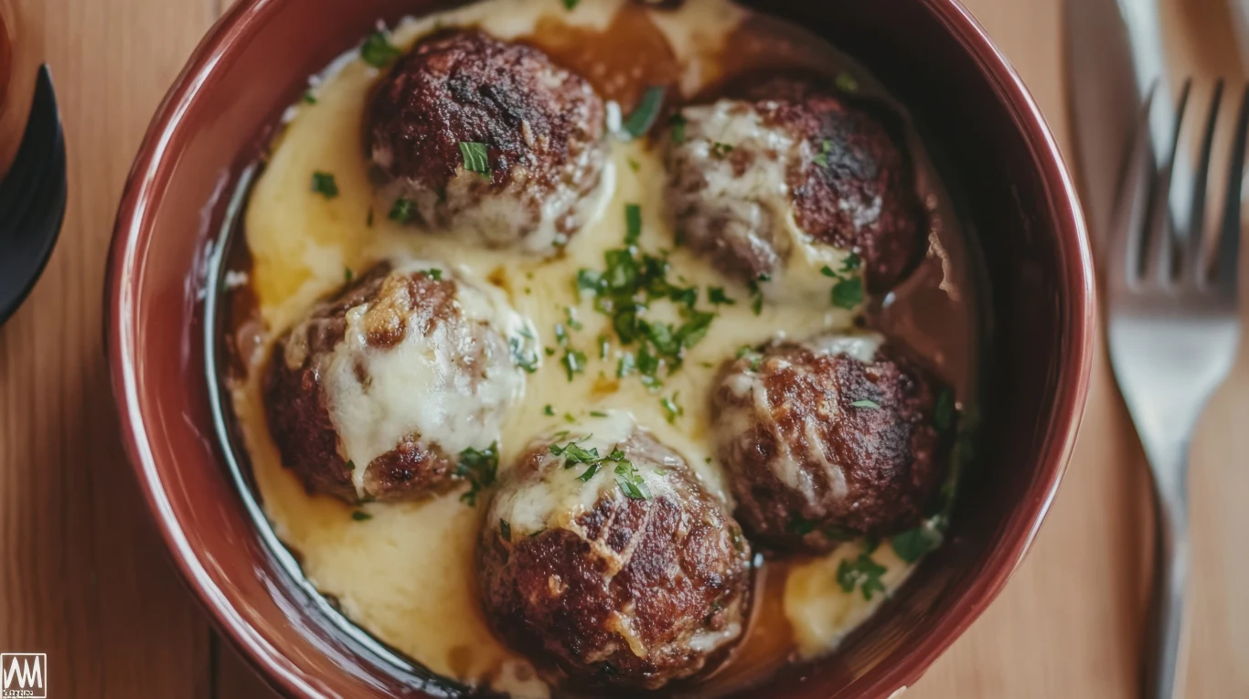Gotowe klopsiki w sosie serowym podawaj oprószone posiekaną natką pietruszki. Smakują świetnie ziemniaczanym purée i surówką z marchewki.