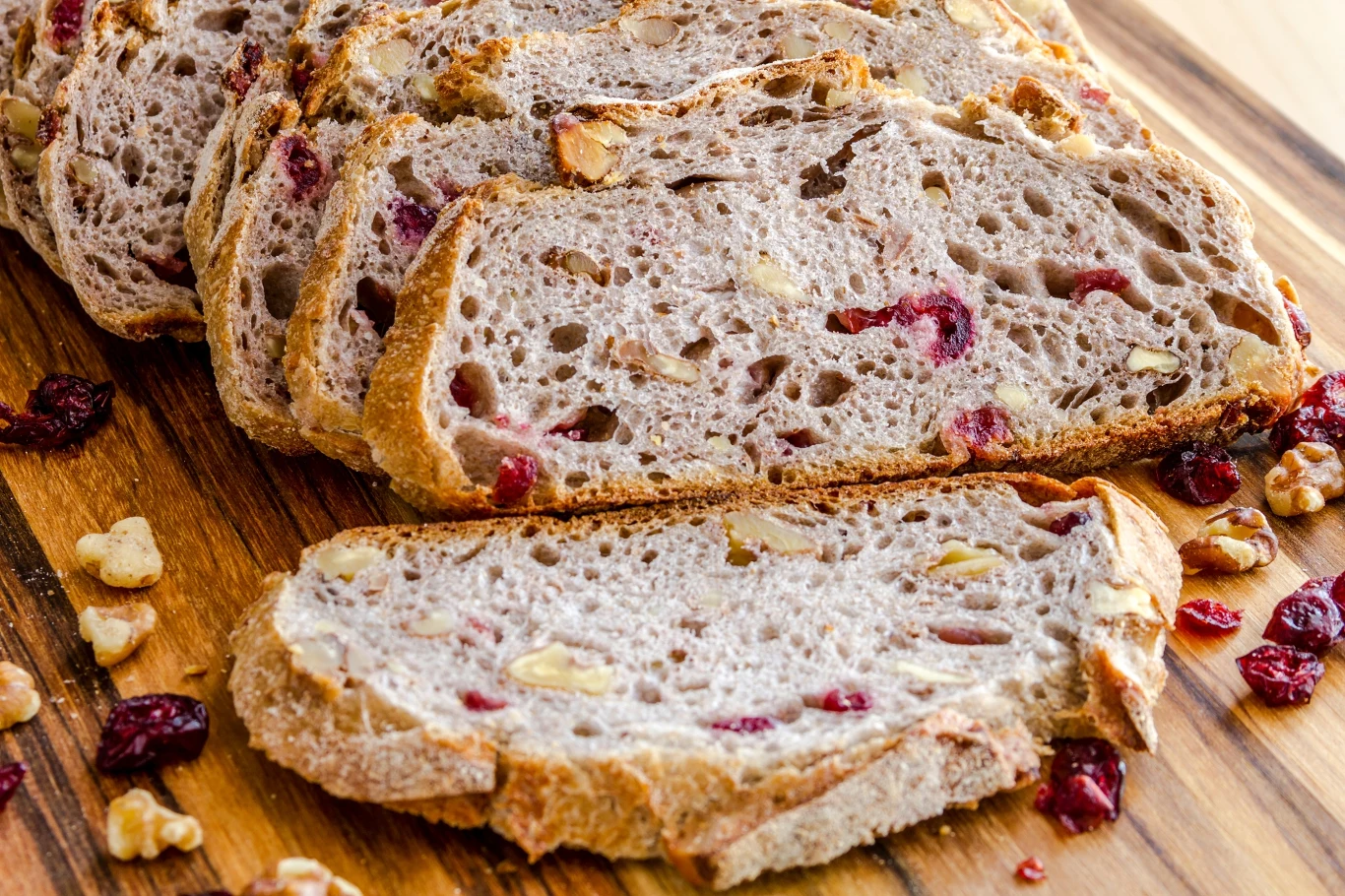 Sposób przygotowania domowego chleba z żurawiną, gruszką i orzechami włoskimi: