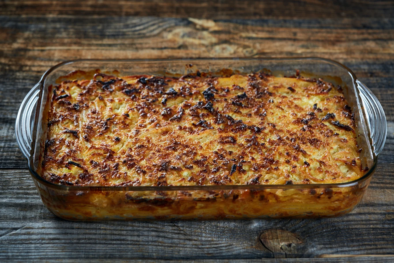 Wstaw babkę ziemniaczaną do piekarnika rozgrzanego do 180 stopni Celsjusza na 80 minut, na dolną półkę piekarnika. Na 20 minut przed końcem pieczenia zmniejsz temperaturę do 150 st. Celsjusza i przykryj danie folią aluminiową.