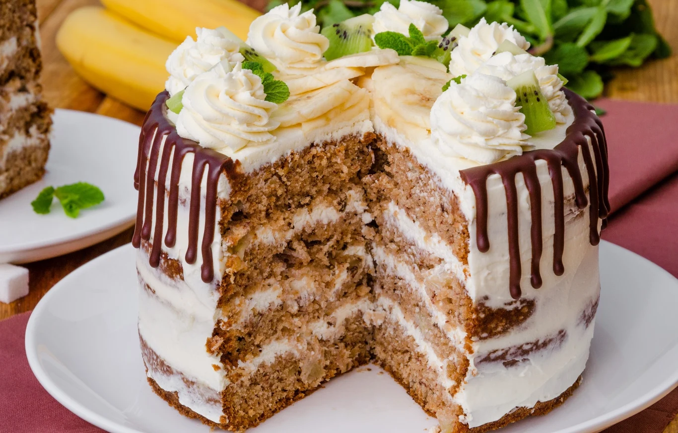 Banany i kiwi do dekoracji pokrój i porozkładaj je na wierzchu ciasta.