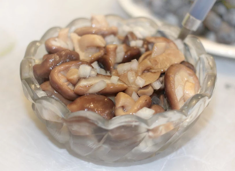 - Słoiki: do wyparzonych słoików włożyć odrobinę cebuli i dodatków, następnie grzyby do 3/4 wysokości. Zalać gorącą zalewą i szczelnie zakręcić.