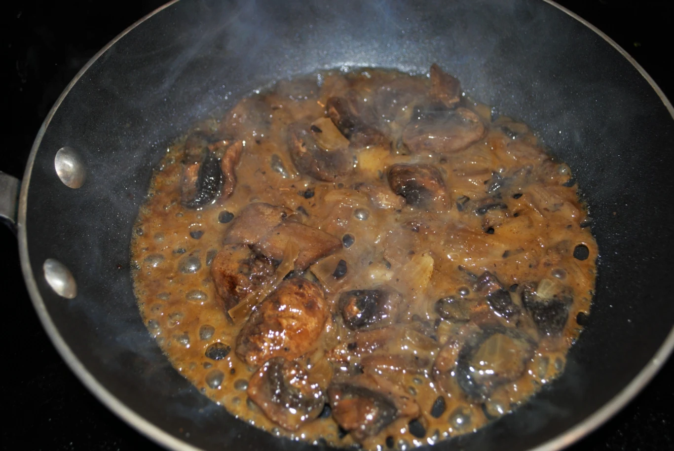 Wlej bulion grzybowy i duś grzyby pod przykryciem przez 20-25 minut. Sos powinien mieć gęstą konsystencję. Na koniec dopraw go według uznania solą i pieprzem.