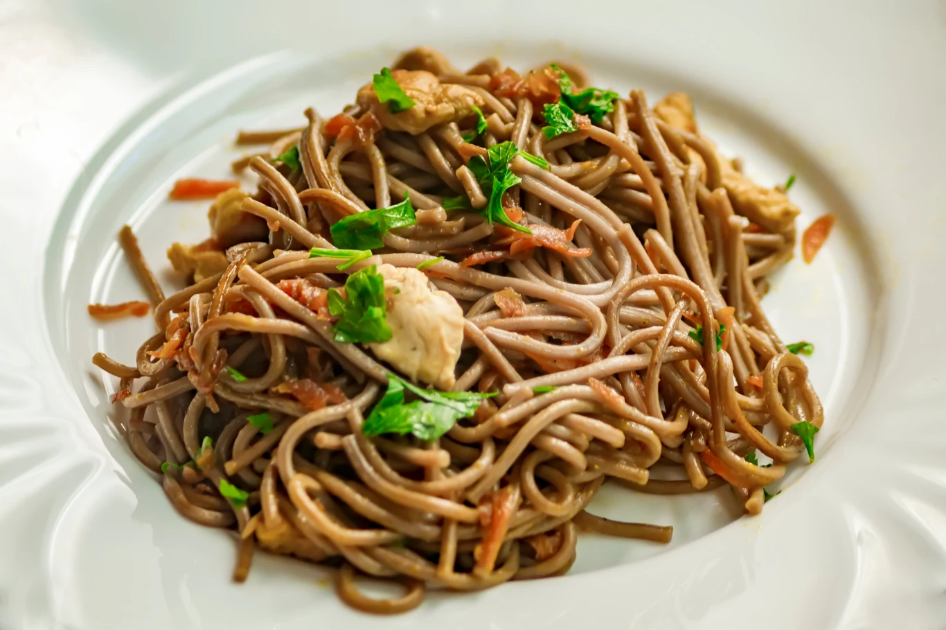 Oprócz niskiego indeksu glikemicznego, soba dostarcza cennego białka - około 5 gram na 100 gram makaronu - wspierając tym samym budowę mięśni, regenerację komórek skóry, syntezę hormonów i produkcję przeciwciał. Dodatkowo, obecność błonnika, witamin z grupy B oraz minerałów, takich jak magnez, magnan i żelazo, sprawia, że ten makaron wspiera funkcjonowanie układu nerwowego, mięśniowego oraz procesy metaboliczne.
