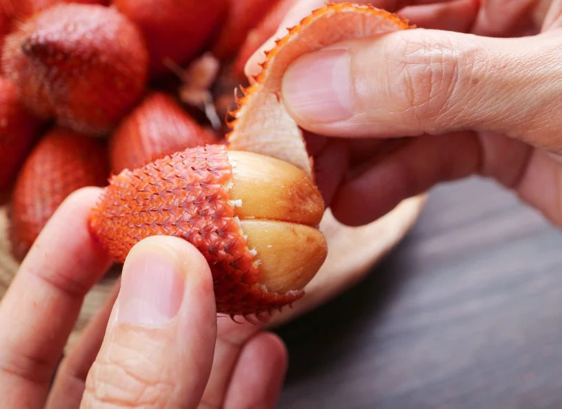 Salak (Salacca zalacca) to owoc palmy pochodzącej z Indonezji, przede wszystkim z Jawy i Sumatry, dziś szeroko uprawianej także w Malezji i Tajlandii. Owoce dojrzewają w ciasnych kiściach u podstawy krzewiastego drzewa, którego długie, kolczaste liście utrudniają zbiory, co częściowo tłumaczy wysoką cenę w handlu detalicznym. Każdy owoc ma łuskowatą skórkę w odcieniach od brązu po żółć; pod nią znajdują się zwykle dwa lub trzy segmenty jasnego miąższu oraz jedna do trzech twardych, niejadalnych pestek. W smaku dominuje słodycz z wyraźną kwaskowatością i nutami kojarzonymi z bananem, jabłkiem i ananasem, a konsystencja waha się od kruchej po chrupiącą i lekko soczystą zależnie od odmiany i dojrzałości.