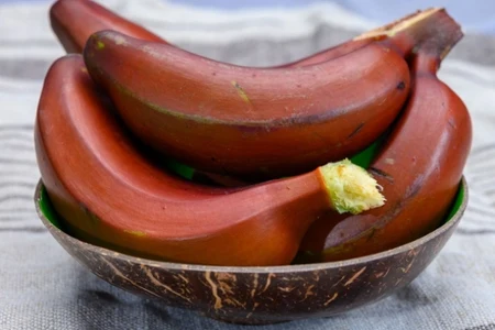 Zwykle jest mniejszy i nieco grubszy niż klasyczny banan, w dodatku ma skórkę w odcieniach czerwieni - od jasnoczerwonej po bordową. W miarę dojrzewania pojawiają się na niej brązowe plamki, które świadczą o gotowości do zjedzenia.