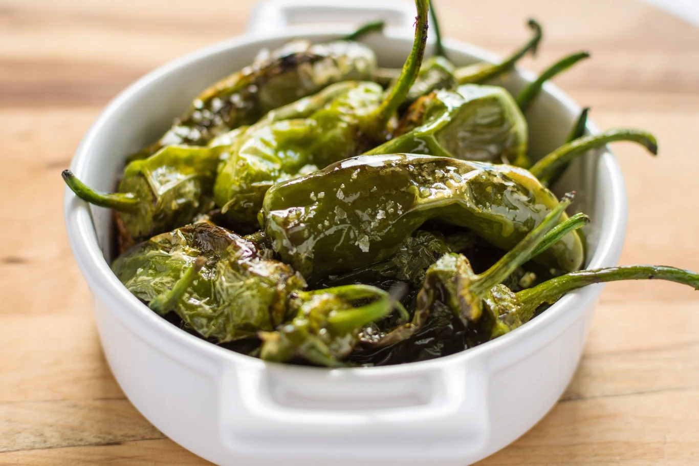 Smaż je przez kilka minut, często potrząsając patelnią albo przewracając szczypcami. Skórka powinna miejscami się zrumienić i powstaną na niej drobne pęcherzyki, a same papryczki mają zmięknąć, ale nie rozpaść się. Na końcu przełóż je na talerz i od razu posyp grubą solą.
