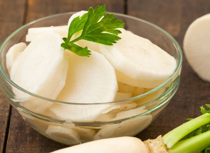 Z surowej białej rzodkwi można zrobić pyszną obiadową surówkę. Korzeń wystarczy zetrzeć na tarce o dużych oczkach, dodać jogurt grecki lub naturalny, przyprawić do smaku i gotowe. Ze świeżego warzywa można również zrobić zdrowy sok wyciskany.